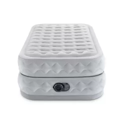 The INTEX® 20in Twin Supreme Air-Flow Airbed is engineered with Fiber-Tech® Construction to provide the ultimate in comfort with the look and feel of a real high-end bed. A network of inter-connected air pockets on the top and sides of the bed cause the air to flow smoothly and gradually across the sleeping surface for unbelievable comfort and stability. Double layered construction allows for standard fitted sheets to tuck in easily.