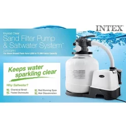 - SYSTEM AND PUMP: Intex 16-inch Krystal Clear Sand Filter and Saltwater System Pump is a great solution for above ground pools with 4,800 to 15,000 gallons of capacity