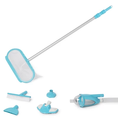 - DELUXE ACCESSORY KIT: Kit includes a leaf rake with debris net, curved wall brush, vacuum head with 2 nozzles, scrubber vacuum, telescoping aluminum pole, and 24-foot hose with connectors