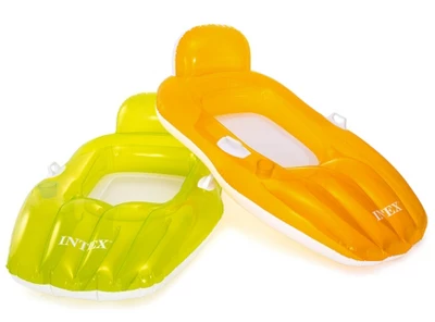 Relax and enjoy by the pool or lake with the Intex 56805EP Chill ‘N Float Lounge 64 X 41 inch 2-pack. Soak up some sun in ultimate comfort, with 2 durable handles, built in mesh bottom, and a place for your icy cold beverage. It comes in two bright colors green and orange. Made with 12 gal vinyl. Fill with 2 air chambers for added safety. Unique comfortable design. Durable handles. One cup holder. For adults only. 220 lb max weight limit.