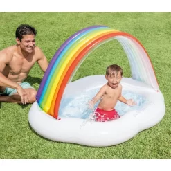 Help your kiddos beat the heat this summer and let them enjoy a relaxing time inside the Intex 57141EP Inflatable Rainbow Cloud Outdoor Baby Pool.This portable outdoor pool measures 56 x 75 x 33 inches when properly inflated and is designed with durability and convenience in mind. The wall height of the pool measures 25 inches and pool capacity is 22 gallons. All in all, this pool is great for children 1 to 3 years old.Perhaps you don’t have a large pool or just want to get your toddler some safe, sun time. If so, this is the perfect pool for you and your family. Keep your kiddos cool this summer with this inflatable rainbow cloud pool from Intex.