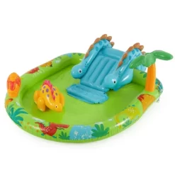 Enjoy fun in the sun in your own backyard this summer with the Little Dinosaur Play Center pool by Intex. Perfect for little ones, this inflatable pool is ideal for a warm day. Smaller and more compact, this water play center is ideal for younger children ages 3 and older. Your kiddos will safely splash and develop water confidence in their own backyard. This splash and play center’s beach and dinosaur theme will be a hit with your little ones. With a length of 75 inches and a width 60 inches, your kiddos will have the space to splash and play to their heart’s content. Complete with a mini slide, palm tree that sprays, and inflatable dinosaur for hours of play, the Dinosaur Play Center will keep them playing all summer long.Beat the heat this summer with a fun pool and play center that will put a smile on your little ones’ faces. The Little Dino Inflatable Play Center will have them splashing with delight. . . . . .