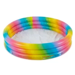 Stay cool and splash away with the Intex Rainbow Ombre Pattern 3 Ring Inflatable Kids Swimming Pool. This air-filled pool will be a great escape for the kiddos, especially on a scorching summer day.This kiddie pool is easy to set up and sits nicely on any outside surface. Simply inflate the pool to the correct size and your little ones can jump in. The pool can maintain up to 154 gallons of water and provides ample inside. In case of a leak, use the included repair patch for a quick fix.Measuring only 66 inches wide and 15 inches tall, the mini pool doesn’t take up much room at all so the kids have plenty of space to run around. Recommended for kids ages 2 years old and up, the portable pool features a rainbow design that will bring a smile to every child. Once your little tykes are done swimming, simply deflate the pool for a hassle-free clean and storage experience.Bring water-filled joy to your kids with the Intex Rainbow Ombre Inflatable Swimming Pool.