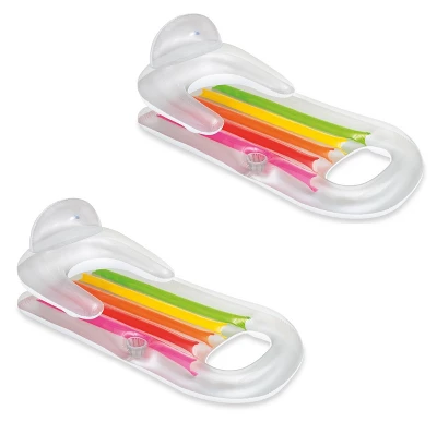 Get comfortable this summer with the classic Intex King Kool Lounge Swimming Pool Lounger 63in x 33.5in Clear 2-pack. Each lounger has a comfortable backrest and armrests for total relaxation and two air chambers for added safety. With the built-in cup holder, you can enjoy a refreshing beverage in the water as you lounge. Approximate deflated size: 63in x 33.5in. Equipped with built-in backrest, armrests and drink holder. Constructed with two air chambers. Designed for adults. 220 lb max weight limit.