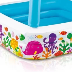 Enjoy fun in the sun in your own backyard this summer with the Dinosaur Play Center pool by Intex. Perfect for little ones, friends and parents who want to join in the fun, this inflatable pool is ideal for a warm day. The pool water height is ideal for younger children ages 3 and older. The walls are 6.375 inches tall with an overall water capacity of 57 gallons. Complete with a slide, palm tree waterfall and hungry dinosaur ball game, the Dinosaur Play Center will keep them playing all summer long!Go under the sea with your little ones and swim with the ocean creatures with this Intex Inflatable Sun Shake Kids Pool. This pool is ideal for kids to splash and play in the shade while parents keep a watchful eye and relax. It has wide side walls and an extra wide sun shade that allows for maximum play in shady comfort. The sun shade canopy is easily removable with velcro if you want some sun to shine through. The Sun Shade Pool features a soft, inflatable floor and 48 inch high walls for your little swimmers to stay safe. Constructed of durable, 10 gauge vinyl, this pool is ready for young ones summer after summer. It has a stylish oceanic scene that makes children feel like they are swimming with sea turtles, colorful fish, octopus, and whales. The Intex Inflatable Sun Shade Kids Pool is a fun addition to your summer for your young swimmers and adds a speckle of the ocean to your backyard.