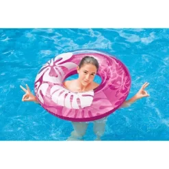 Great for swimming pools and the beach, the Intex Clear Color Tube adds to the fun of water play. This 36 inch diameter inflatable tube features a fun and colorful design.These swim tubes are ideal for floating, swimming, or playing with in the pool. Designed with flower graphics printed on 3 assorted color choices: blue, orange, and pink. Add some fun under the sun this summer with these inflatable inner tubes.Please note: Offer is for 1 tube only. Style may vary between the variations pictured.