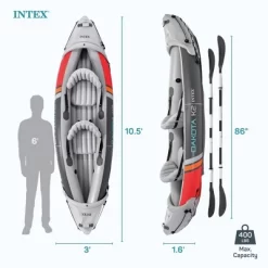 - HOLDS 2 PEOPLE UP TO 400 POUNDS: Inflatable 2-person kayak with included 86-inch long oars and air pump can hold up to 400 pounds; Dimensions (L x W x H): 10.25 x 3 x 1.6 feet