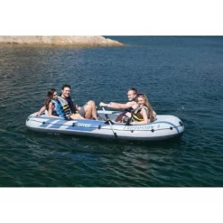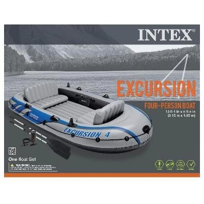 You spend a lot of time on land, but you don’t truly live until you are out on the water. The Intex Excursion 4 Boat Set gets you out there exploring and rowing.The Excursion 4 is ready for lots of expeditions. It’s a great boat for 4 adventurists who love spending time on the water paddling, fishing, or floating down the river. Designed with heavy-duty, puncture-resistant PVC vinyl, this boat is made to get through every excursion you go on. It’s durability and comfort is superior with an inflatable I-beam floor and 2 inflatable seats with backrests. The boat contains 3 air chambers, a Boston valve, motor mount fittings, 4 built-in fishing rod holders, a gear pouch, and an all-around grab line. The set includes 2, 54-inch aluminum oars, welded on locks and oar holders, and a high-output pump for easy inflation and deflation.If you’d rather be boating and the lake is your happy place, get out there and journey on the water with friends on the Intex Excursion 4 Boat Set.