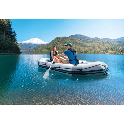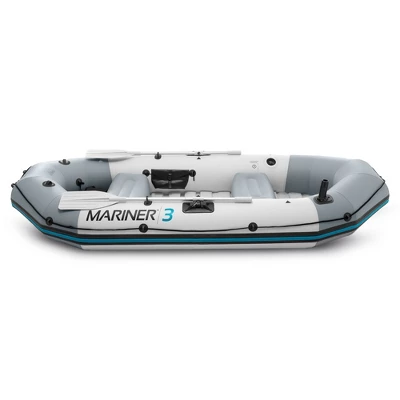 The Intex Mariner 3-Person Inflatable Boat Set is the perfect boat for serious outdoor enthusiasts, campers, those who love to fish, or anyone else looking for a high-quality, durable boat. This 3-person Intex Mariner is GS certified, holds up to 790 pounds, and includes a keel rock guard and heavy-duty plastic flooring for stability. The structure is highly durable with dual outer layers of heavy-gauge PVC laminated to an inner layer of polyester mesh for extra reinforcement. The design also allows more air pressure for greater rigidity while maintaining the material’s natural flexibility. The 2 Boston valves allow for quick-fill and fast deflation efficiency and convenience. This set also includes (2) 54-inch oars and oar holders, 2 built-in fishing rod holders, and a gear pouch to keep your necessities safe and nearby.The Intex Mariner 3-Person Inflatable Boat Set is ideal for a day on the lake or river and is built to get you there and back every time.