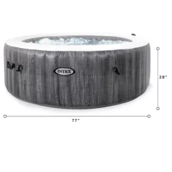 Let your worries bubble away as you unwind in the Intex PureSpa Plus Portable Inflatable Hot Tub.The PureSpa provides relaxation at the touch of a button with its easy-to-use control panel that activates high-powered bubble jets surrounding the interior of the spa for a refreshing massage. Easily operate the pool’s controls from the Intex smartphone app, which lets you schedule the heating cycle and check to see if the filter cartridges need changing. The heating system adjusts to fit your preferences for a relaxing experience.This particular PureSpa also features built-in LED lighting, headrests, and a built-in hard water treatment that system stops calcium buildup to keep your spa time comfortable. Set up is easy and ready for water in just about 20 minutes. The included spa cover saves on energy and protects the spa from damage. Package includes tub, insulated cover, heating/filtration/air blower/hard water system, color-changing LED light, 2 filter cartridges, 2 headrests, thermal ground cloth, inflation hose, carry bag, floating chlorine dispenser, and test strip.If you’ve always wanted a hot tub without permanently taking up space on your patio, this PureSpa Plus hot tub is a relaxation game-changer.
